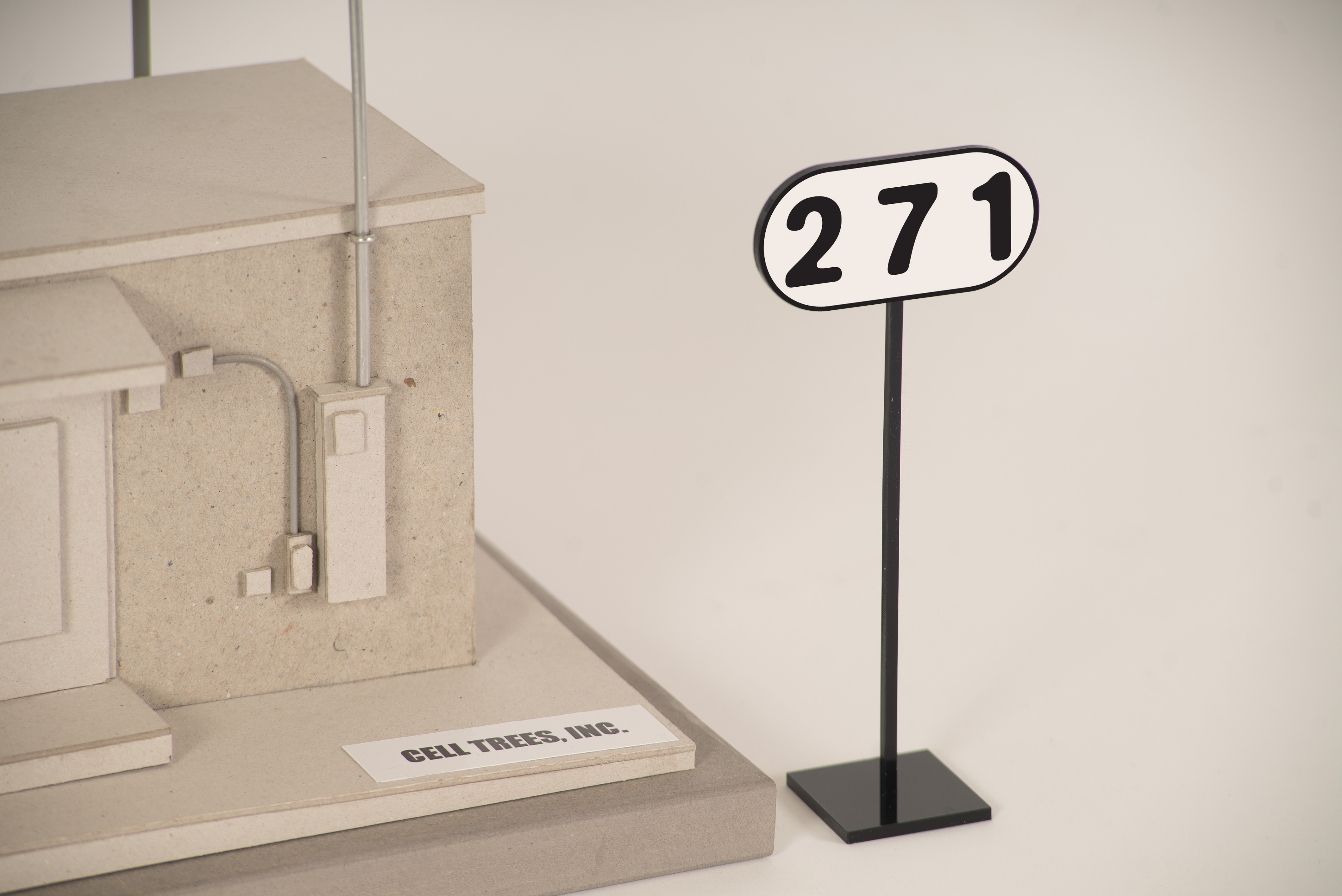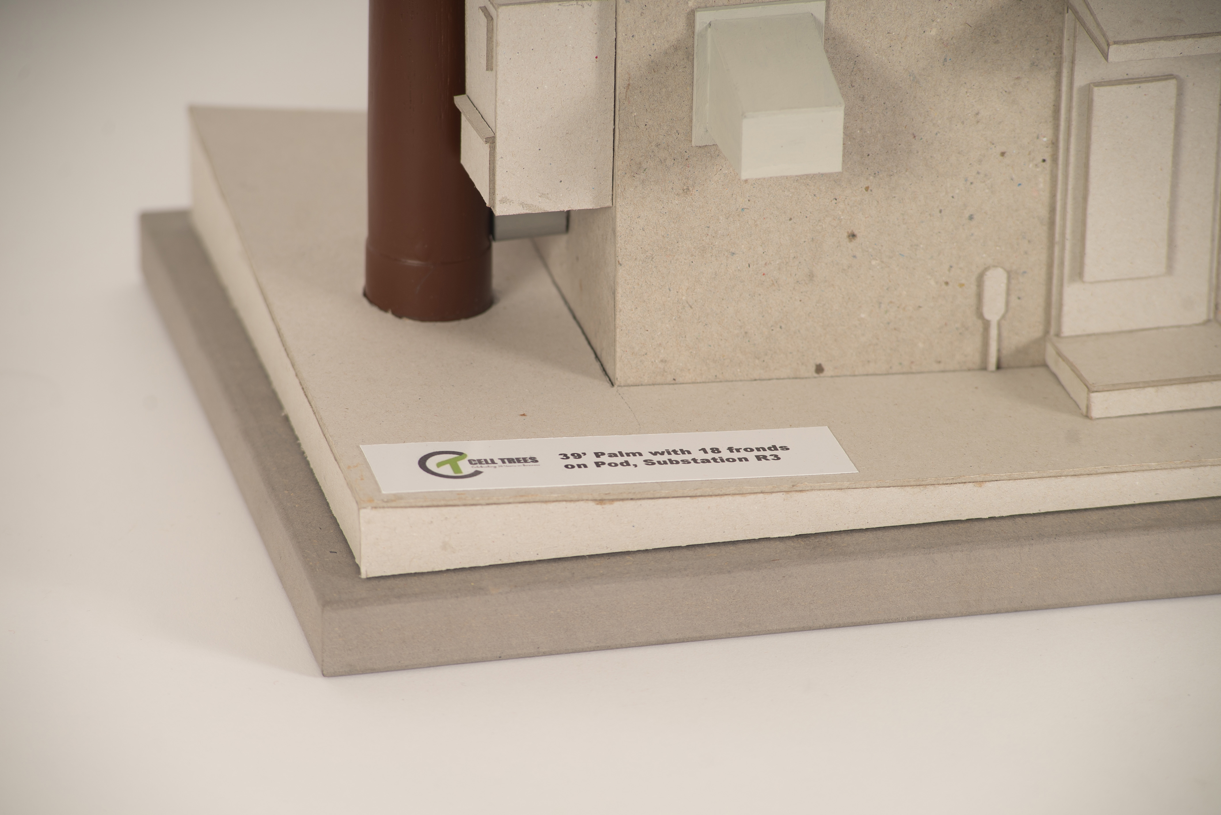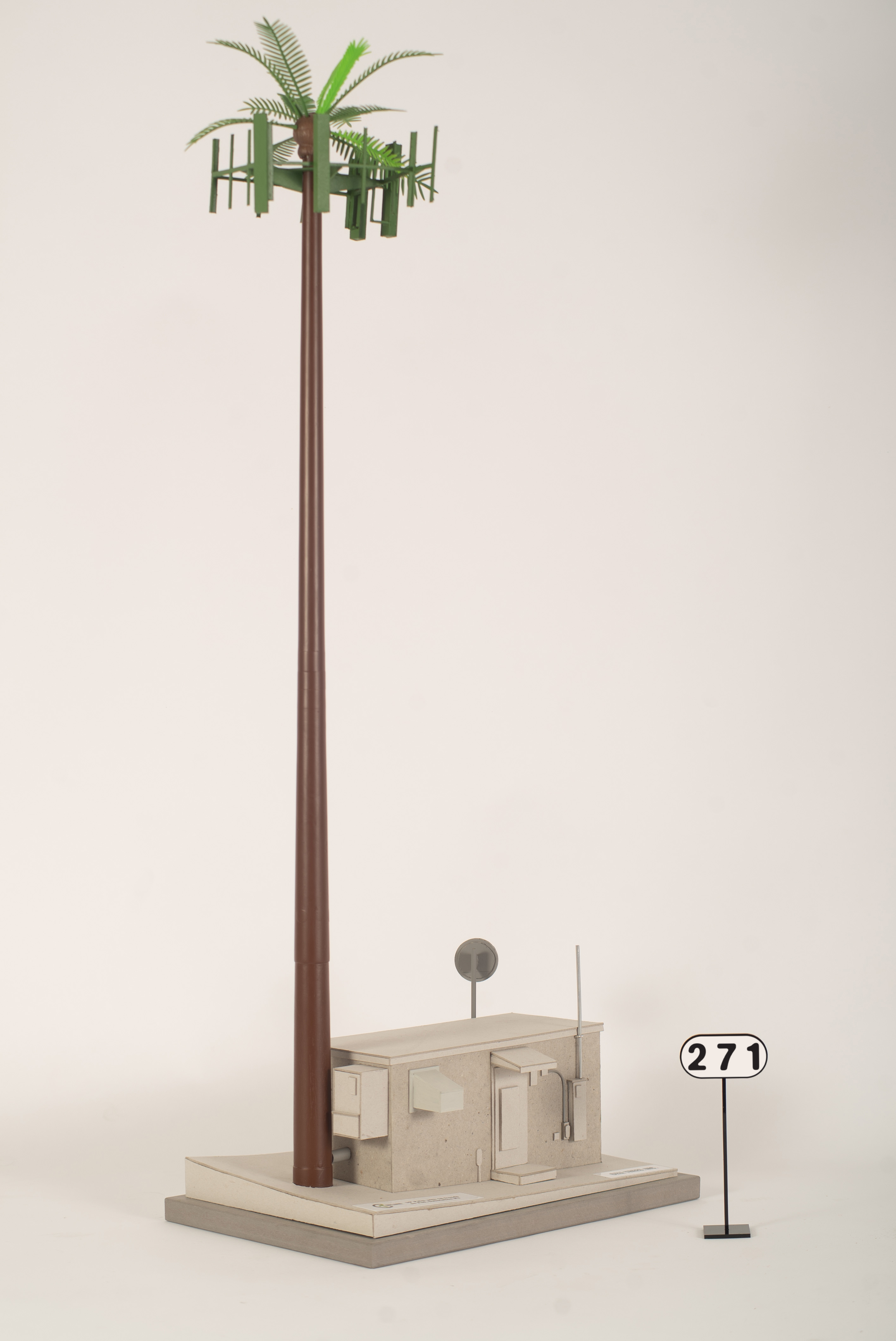 Ths model of a cell tower disguised as a palm tree was obtained at the Californian office of CELL TREES Inc. It shows a 39’ palm with 18 fronds on pod with a substation R3. Type in #754 to see a similar model built in the desert of California.