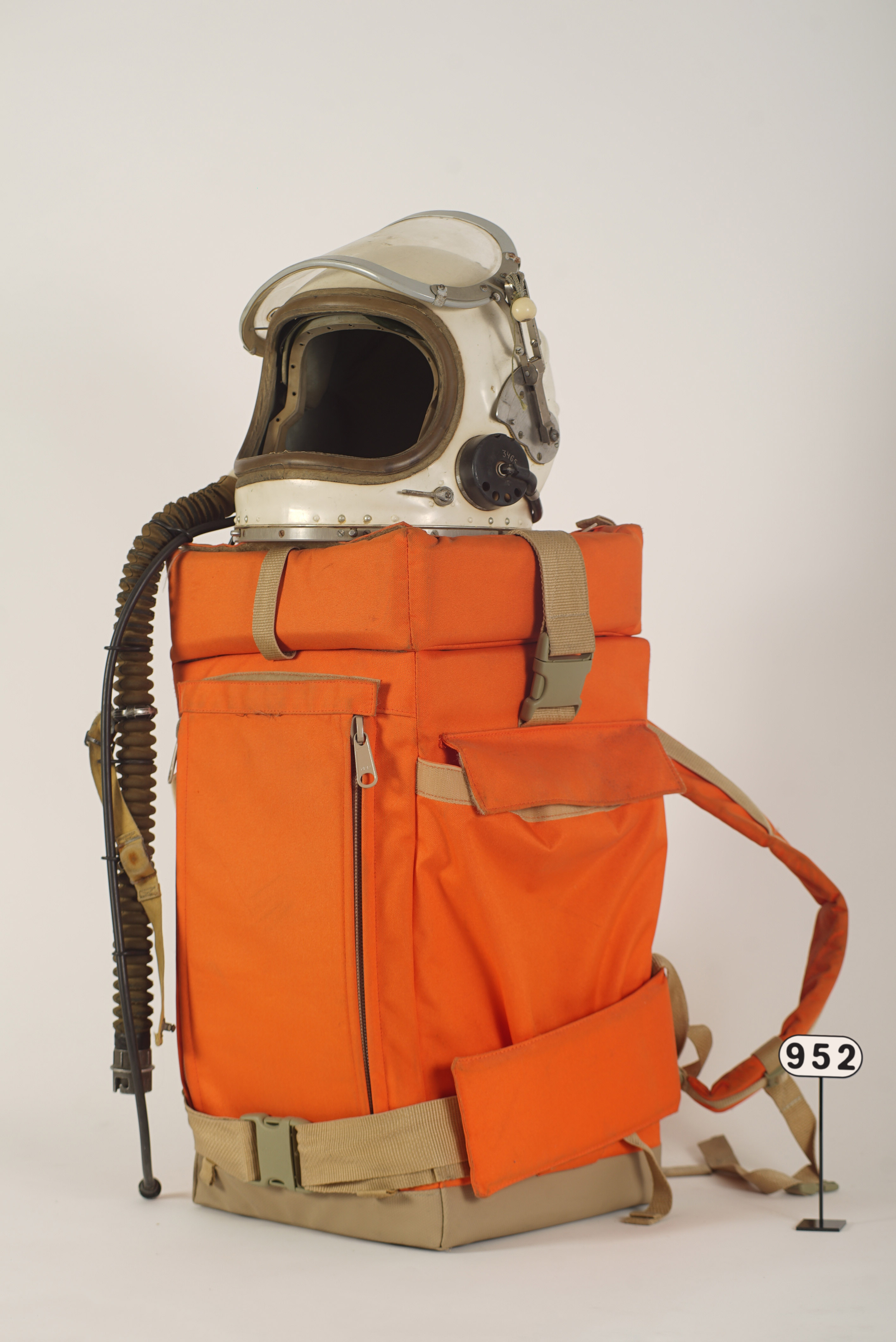Expedition backpack and atmosphere helmert, part of the exhibition gear.